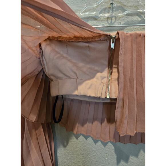 Elevate your wardrobe with the Michael Costello Cropped Blouse in a stunning pink hue. This off-the-shoulder blouse, crafted from soft fabric, features elegant pleating and a convenient zip closure, making it a chic choice for any formal occasion. Its regular fit and short sleeves offer a comfortable yet sophisticated look, perfect for spring events like weddings, garden parties, or upscale dinners. Hand wash only to maintain its pristine condition. New and ready to make a statement in your collection.