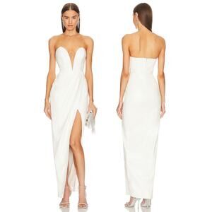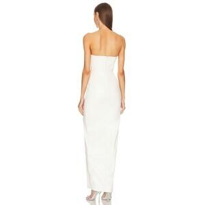 The Michael Costello x REVOLVE Jake Gown in optic white features a bold strapless design crafted from sleek faux leather. Its modern silhouette makes a striking statement, ideal for high-fashion events or edgy, upscale occasions.