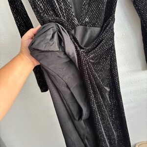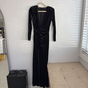 Step into glamour with the Michael Costello x REVOLVE Sheana Gown. This velvet sensation boasts a daring plunge neckline, creating a captivating silhouette. With a maxi length and an emphasized side slit, it's a nod to retro style with a modern, chic twist. Make a statement at your next formal affair.