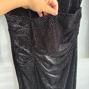 Ribbed velvet fabric with ruched detail at hi seam slit