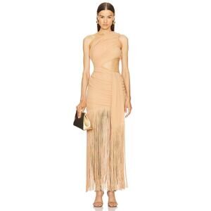 The Michael Costello x REVOLVE Tania Fringe Gown in Sand exudes high-fashion drama with its one-shoulder silhouette and sultry side cut-out. Detailed with cascading fringe for dynamic movement, this gown brings sophistication and allure to any formal occasion. Perfect for red-carpet events or glamorous evenings.