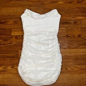 Michael Costello x REVOLVE ruched stain Bardot Mini Dress in Ivory small