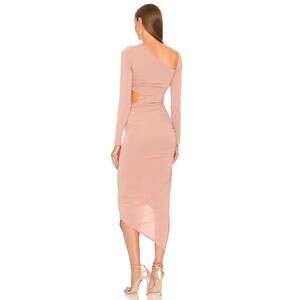 The Michael Costello x Revolve Ansel Dress in nude features an alluring asymmetrical design with a bold side cut-out and a high slit.