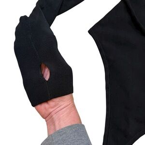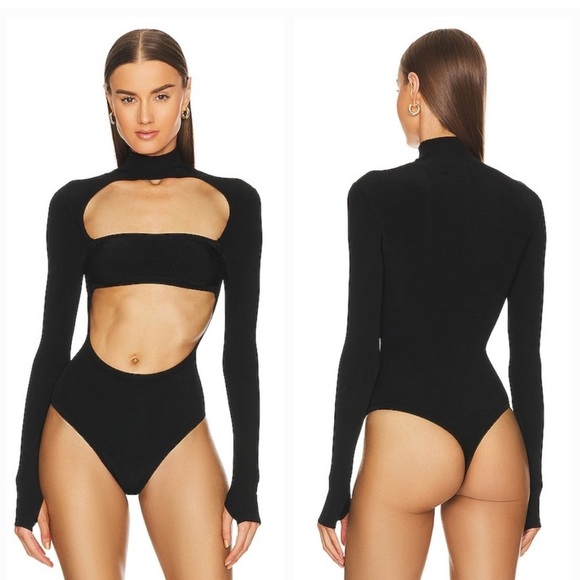 This sexy body shaping Michael Costello x REVOLVE Talina Bodysuit in Black is a size medium. It is new without tags and features a high neck, front cut-outs, long sleeves with thumbhole details, and a thong back with gusset snap button closure. It is made from ribbed jersey fabric, composed of 78% rayon and 22% spandex.