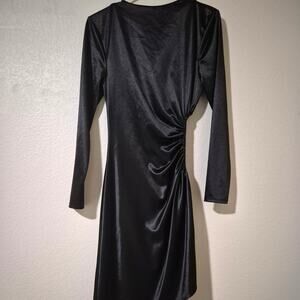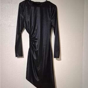 The Michael Costello x REVOLVE Daya Midi Dress features padded shoulders, a ruched cut-out detail at the side, and a hi-low hem. This dress is made in China from 92% polyester and 8% spandex. It has long sleeves, a cut out, and a midi length. It features slinky jersey fabric with a subtle sheen finish. It has a pull-on styling and should be dry cleaned only.