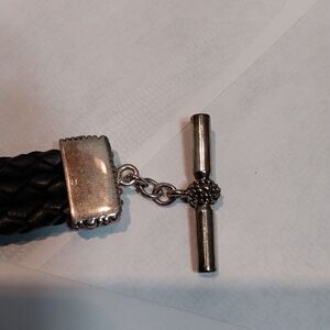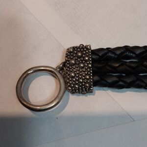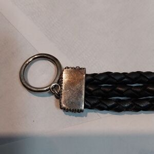 This bracelet has three rows of genuine leather with sterling silver end caps. It is in perfect and unused condition. It will fit most wrists. The leather is black. It is new but has no tags or box. The bracelet measures about 6.5" with the adjustable extender.