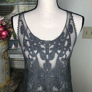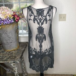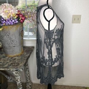Beautiful sheer embroidered tunic top in a medium gray. Wear over a tank or be daring and wear with your favorite bralette or swimsuit. In excellent condition