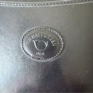 Thick black polished leather with solid brass hardware, 3 slip pockets.