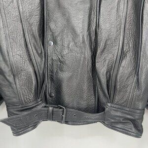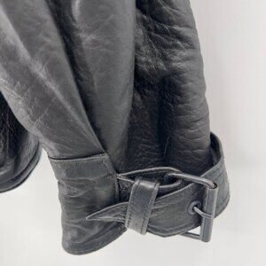 Classic vintage Michael Hoban North Beach genuine leather jacket in black. Features a structured oversized fit with unique snap button front, buckle details at cuffs and waist, epaulets, and interior pockets. Heavy, supple leather with quilted lining for comfort and durability. Size 38 (fits like a men’s medium, but please check measurements). Made in USA. A true collectible piece with iconic 80s/90s style.