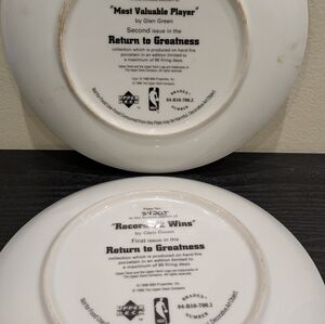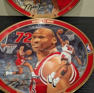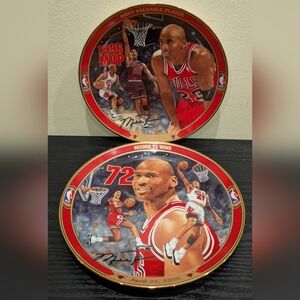 Set of two Michael Jordan commemorative plates featuring vibrant red and black designs. Perfect for basketball fans and collectors.