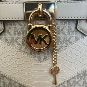 Chic Michael Kors satchel cross body purse with a stylish tan and gold design. Features signature MK pattern and elegant hardware. Perfect for any occasion. Makes a great gift!