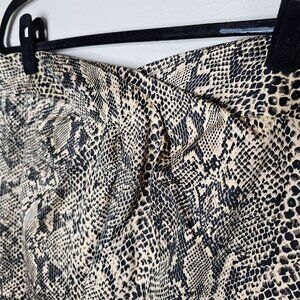 Tan with black snake print. Twist detail at the front of the waist. Slit in the back. Zips in the back.