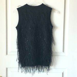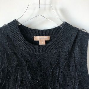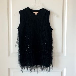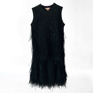 Michael Kors Collection Feather Embellished Cashmere Knit Skirt & Top, Charcoal Melange. Hand applied Ostrich plume feather embellishments provide dreamy movement w/tonal sequins that provide an understated shine. A-line silhouette; Ostrich fringed hem; pull on skirt w/elastic waist.. Top has crew neckline, sleeveless, ribbed trim; fitted silhouette, pullover style, ostrich feathers, 100%cashmere. Retail over $3,000. Skirt 27" length, 28" Waist (will stretch).Top 17 1/2" pit to pit, 27" L.