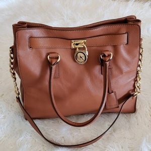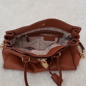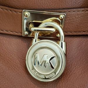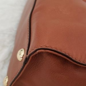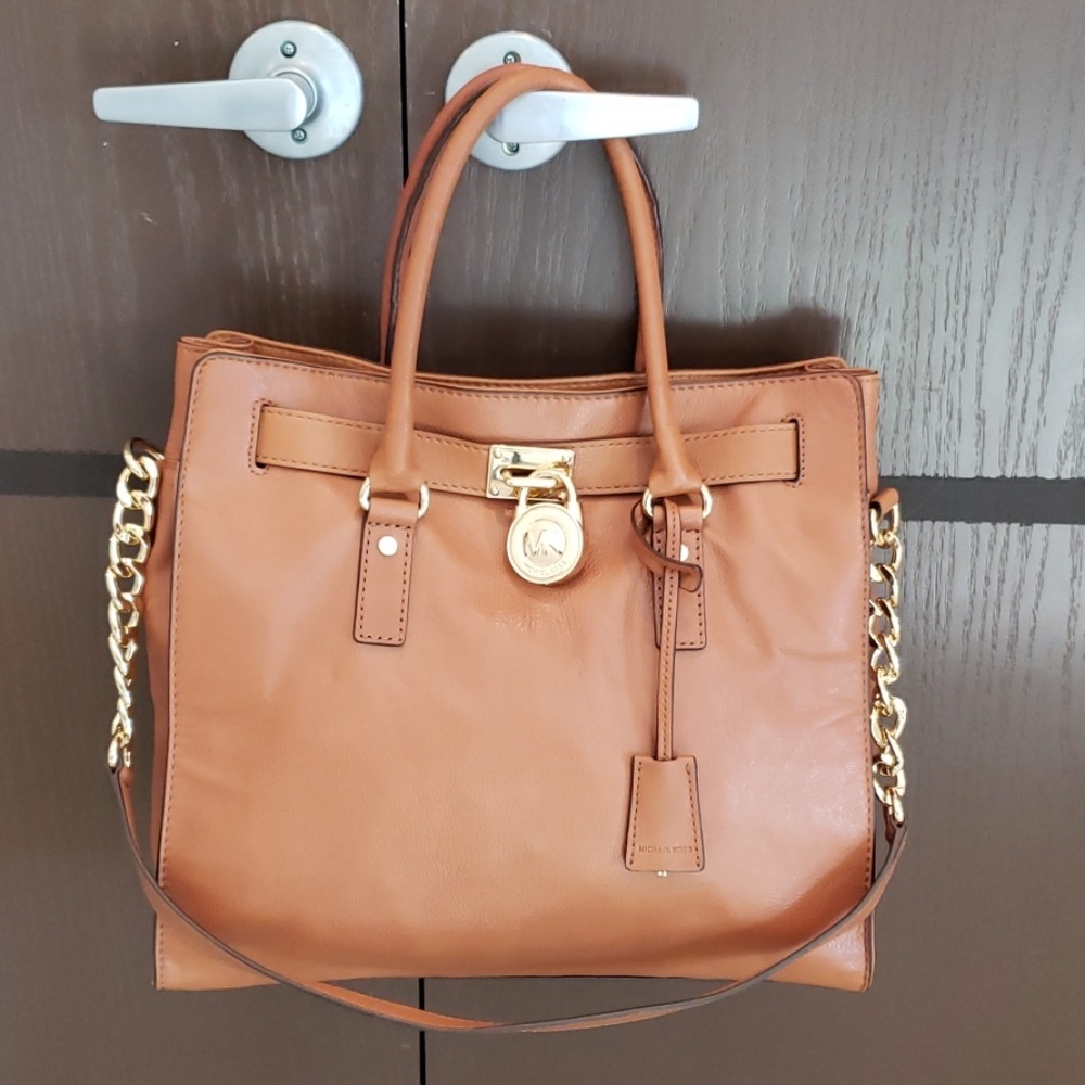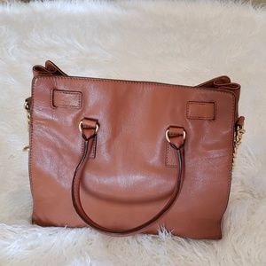 Used Michael Kors bag in good condition with minor scratches as shown in the pictures. Size of the bag is approximately 14X13 inches, brown in color. Soft leather. No returns.