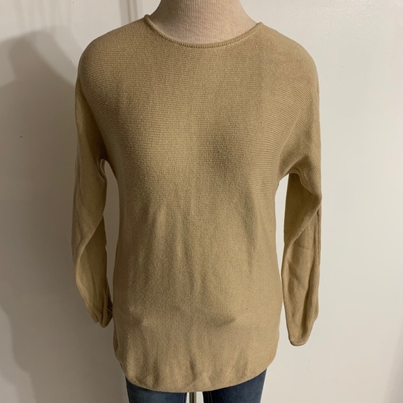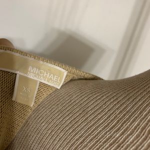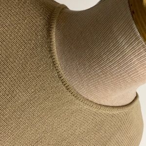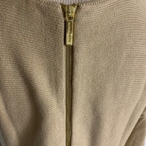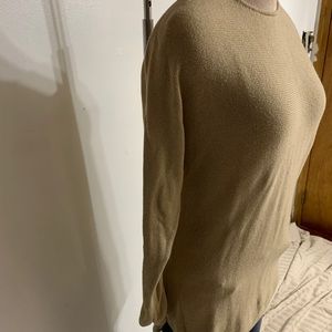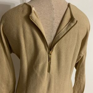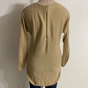 MMK pullover sweater. Crew neck, bottom of the shirt scoops in the front and back and comes up on both of the side. Zipper at the top of the back, and it does unzip.