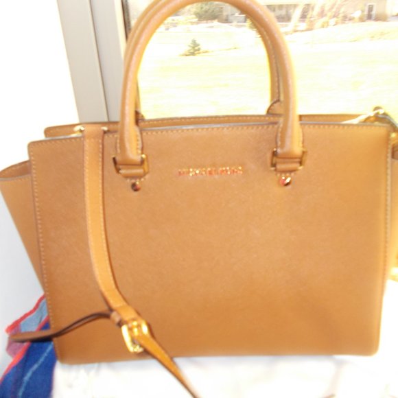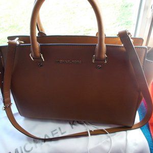 This is a brand new and authentic Michael Kors handbag that is made with saffiano leather, which makes it easy to clean. It is an extra large size. I also have this for sale in navy blue color. I purchased in a lot of handbags that I won from a local retailer. All my items comes from a smoke and pet free home. Please email me for any questions and thank you for looking at my items.