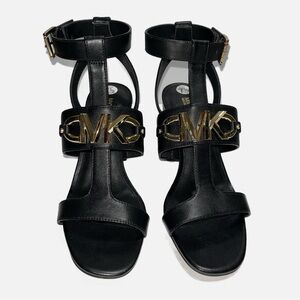 The sandals are made of faux leather with metallic detailing, including the Michael Kors logo