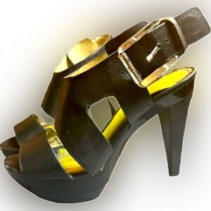 These Michael Kors shoes are black, open-toed high heels with a distinctive silver buckle. They feature a thick black heel, buckle closure at the ankle for secure fitting. They’re perfect for a night out or a special occasion.