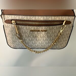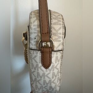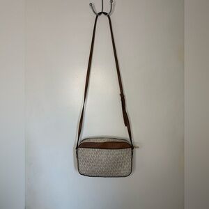 This Michael Kors crossbody bag showcases a sophisticated brown and cream color palette with a signature monogram print. Its compact design and adjustable strap make it an ideal choice for everyday use, blending style with practicality.