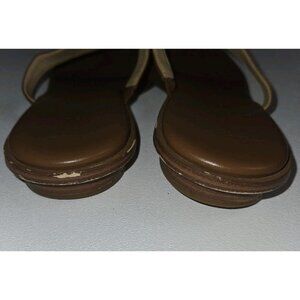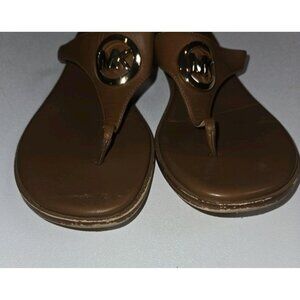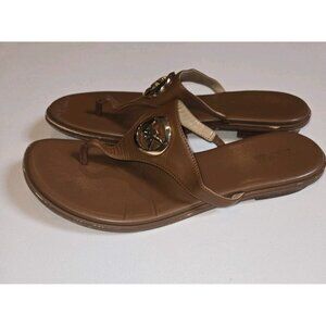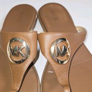 Michael Kors AQ14J Women's Sandals 9 M Brown Leather T-Strap Gold Logo MK Tan