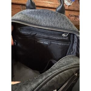 Michael Kors Abbey Medium Backpack with floral appliqués and studs. It is a black, medium-sized backpack featuring the brand's signature logo print canvas and silver-tone hardware.