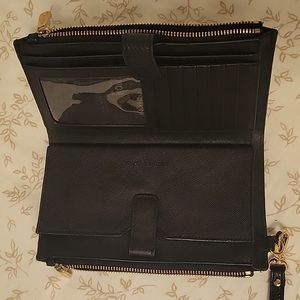 1 interior ID window pocket, 6 credit card slots, 2 slip pockets, 1 phone pocket, 1 large open compartment & 2 zip compartments