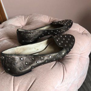 Ailee Studded Leather Loafers. Michael Kors Women's Dress Shoes. Metallic Leather. Silver studs. Rubber Heel is 0.25 inches. Leather Sole. Worn a couple of times. Retails at $165. Inquire if you have more questions!