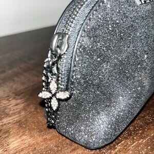 Great, lightly used condition, it features a fully functional zip around closure with rhodium tone chain attached & a cubic zurconia embellished flower charm for an added touch of glitz. Color is all-over black with a gorgeous exterior glitter finish made with Saffiano Leather. With a matching metal tone, the designer name and logo can be seen on the outer upper side in all capital lettering. Interior has a signature fabric lining with a logo pattern and side slip pocket with embroidered accent.