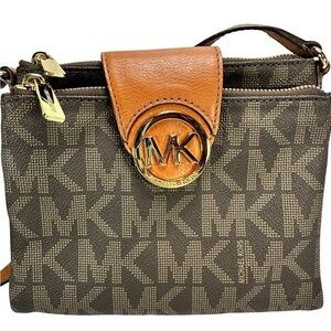 The Michael Kors All-In-One Crossbody Bag is a stylish and practical accessory for women. Made of Saffiano and Vachetta leather with a coated finish, this medium-sized square-shaped bag features a natural exterior color with brown accents and gold hardware. It has a zip, magnetic, and snap closure with a crossbody strap handle, making it versatile for everyday use. The bag is designed with inner and outer pockets, an organizer, inner dividers, and an adjustable strap for convenience. The Michael Kors logo pattern adds a touch of luxury to this functional crossbody bag.