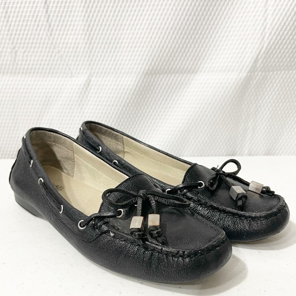 Michael Kors Amber Black pebbled bow tied tassel moccasins like flats. Please see all pics for overall condition. Very small wear showing on the soles. The tassel hardware shows some fading. Other than that the shoes are in great condition. All leather true to size- 6M