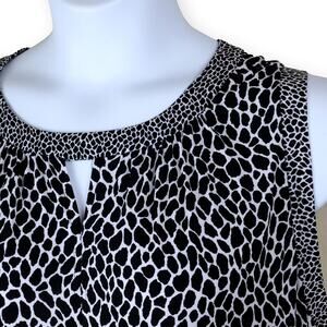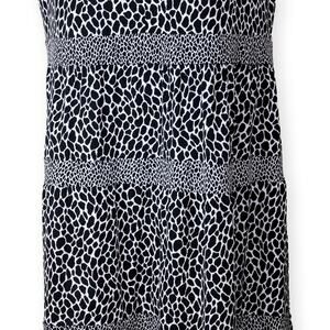 Super flattering Michael Kors midi dress in a black-and-white animal print jersey knit. Tiered skirt, A-line shape, and a chic keyhole neckline. Back zipper, soft stretch, and excellent pre-owned condition. Easy to dress up or down.