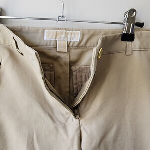97% cotton 3% elastane khaki pants by Michael Kors. Women's size 8. Gold tone hardware. Zippered pockets. Zip and button fly closure. Belt loops. Pockets sewn shut on the back.