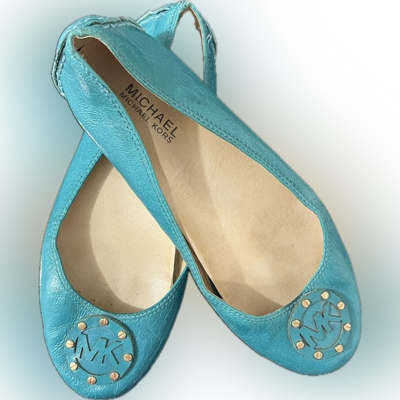 Unique & Elegant aqua blue flats with signature MK logo. Gold stud details add a touch of luxury. Ideal for versatile styling. Size 8.5 no box lightly used.