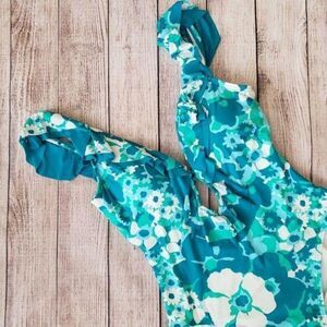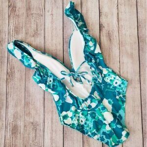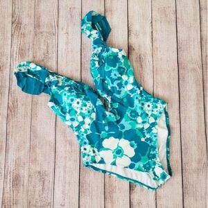 Michael Kors Aqua Blue Floral Plunging Neckline One-Piece Swimsuit