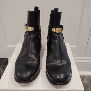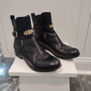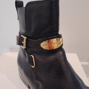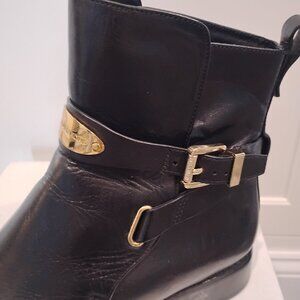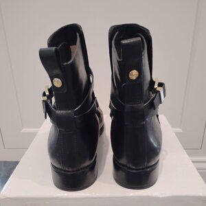 Step out in timeless style with these MICHAEL Michael Kors Arley ankle boots. Crafted from smooth black leather and accented with gleaming gold hardware, they feature a chic buckled strap that wraps around the ankle and a logo-engraved plate for a signature touch. The round toe and low 1" heel offer everyday comfort, while the 5" shaft and 10.5" circumference provide a flattering fit. Finished with a durable rubber sole, these boots are perfect for elevating both casual and dressy looks.