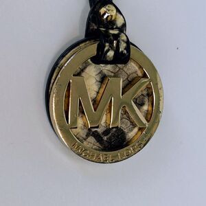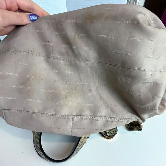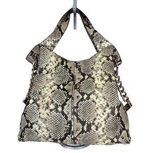 Michael Kors Astor Uptown shoulder bag in python snakeskin in tones of beige and black. This stunning and unique bag features front and back stud detail, double top straps, and a longer removable shoulder strap with gold chain detail. This purse also includes a Michael Kors logo keychain fob with the same leather snake skin detail. Magnetic snap top closure, roomy fabric interior includes 5 slip pockets and one large zip pocket. Very good used condition - small mark and wear on exterior leather, small mark to top edge on interior, multiple makeup marks on interior lining (cleaned, but still stained), all shown photos. Measurements: 15"L x 11-13"H x 5"D, 6" handle drop, 16"shoulder strap drop