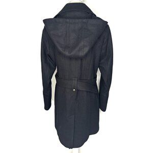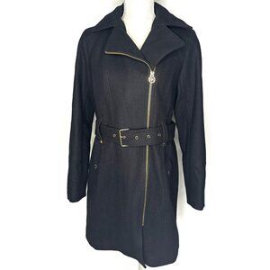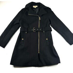 Michael Kors Asymmetric Zip Wool Blend Coat Black Women's Size 8 Belted Hooded