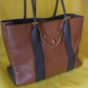 A Michael Kors Austin Satchel is the stylish companion that will be perfect to meet every day your needs. It has an organized interior with a zipper compartment, 2 slip pockets, 1 large, zippered pocket and key loop. The spacious inside assures that you will have enough space for your valuables. The exterior displays the signature print coated canvas trim and 100% imported cognac pebble leather. The gold tone hardware on the front logo, bottom feet, and snap closures, gives this bag an upscale classy look. The back of the bag is adorned with a double chain purse charm complete with decorative charms. So, get ready for your next meeting, event, or just out for the day, because with this satchel you will arrive in Style!