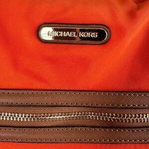 Michael Kors Burnt Orange nylon large tote with gold hardware and brown leather trim. Good pre-loved condition. Some small discolorations as noted on pics. One small portion of handle is slightly unraveled. Get it now for fall!