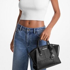 NWT Michael Kors Avril Small Studded Patchwork signature Logo Satchel. Beauty and versatile, this Michael Kors black satchel is perfect for any occasion. Crafted with attention to detail, it offers both style and functionality. Adds an edge to any outfit!