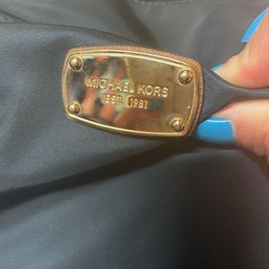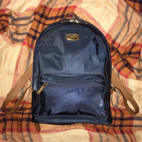 Navy Michael Kors backpack with brown leather straps. Used and in good condition. Couple of scuffs- base of bag and back by strap pictured. Zippers are gold.