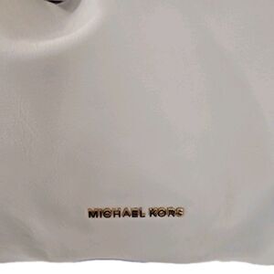 The Michael Kors bag is a stylish shoulder bag with a rectangular shape, featuring a zip closure and gold hardware accents. The exterior is made of white leather with a coated finish, while the interior includes inner pockets for organization. It comes with a black leather handle/strap , gold-plated hardware, and a beige fabric lining. This designer bag from the Michael Kors Signature collection is a fashionable accessory for women, perfect for adding a touch of luxury to any outfit. see the pictures for description.