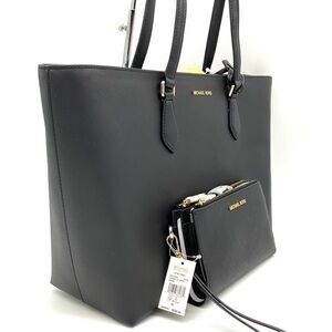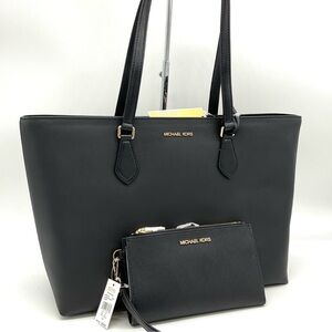 Michael Kors Bag Large Sheila Mf Tote Bag & Large Double Zip Wallet Black/Gold