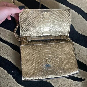 Michael Kors gold evening bag clutch with crossbody strap. Interior is in great condition; however, the exterior has 2 very worn spots around the snap closure (pictured). Please note that this is being sold as-is, and the price reflects this wear.