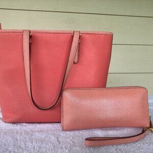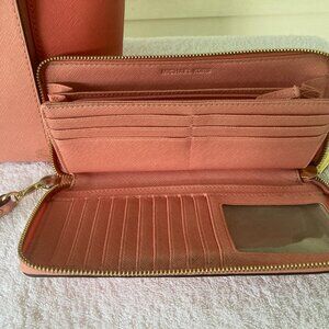 Michael Kors bag with matching wallet. They are both tangerine in color, perfect for Spring and Summer. Both are slightly used. The handbag has an attached keyring - making it easy to find your keys. It also has 3 separate sections for keeping your necessities, and inner side pockets for more storage. The matching wallet has a hand strap for those days when that's all you want to carry around. It has plenty of room for credit cards, drivers license, and more.