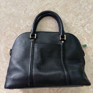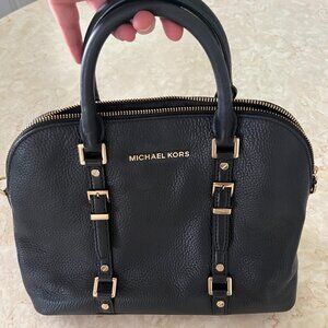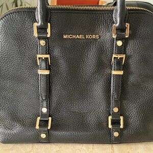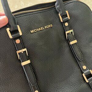 Michael Kors Bedford Legacy dome satchel in black pebbled leather with gold tone hardware. Top handle design with top zip closure. Clean, fabric-lined interior with multiple pockets. One exterior pocket. Gold-tone hardware and logo etc. Missing crossbody strap and logo fob, but still functions as a stylish and high-quality top handle bag. Clean interior and exterior. Slight abrasion on bottom feet rivets. Few other signs of wear.