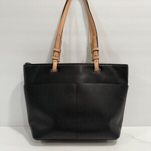 Description: Michael Kors Bedford Medium Pebbled Leather Pocket Tote Handbag Black Tan Straps