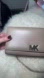 Elegant Michael Kors clutch in beige. Features a stylish silver chain strap. Perfect for any occasion.