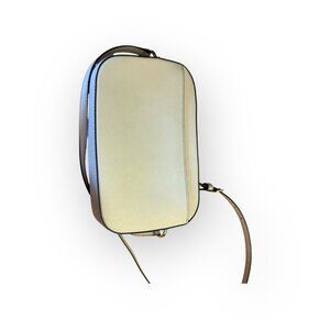 Elegant structured crossbody bag by Michael Kors in a light beige tone with gold chain and hardware accents. Features a top zipper closure, adjustable strap, and sleek silhouette perfect for everyday wear or semi-formal outings. Interior includes quilted lining and a small pocket for essentials.