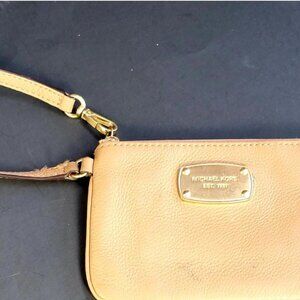 Michael Kors wallet, beige wristlet, MK leather purse, designer card holder, MK wallet, small zip wallet, minimalist purse, spring accessories, travel wallet, beige leather wallet, pre-loved Michael Kors, gold zipper wallet, luxury wristlet